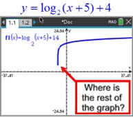 | On the logarithmic graph above, the calculator is "trying" to plot points on the graph to the left. But the graph is SO CLOSE to its vertical asymptote of x = -5, there is no room to put additional pixels before it crosses over the asymptote. Plotting points "straight" down would violate the graph being a function, and f (x) on the TI-Nspire plots functions. The logarithmic graph continues downward toward negative infinity approaching the asymptote x = -5. (Graphing it as a "relation" won't help.) |